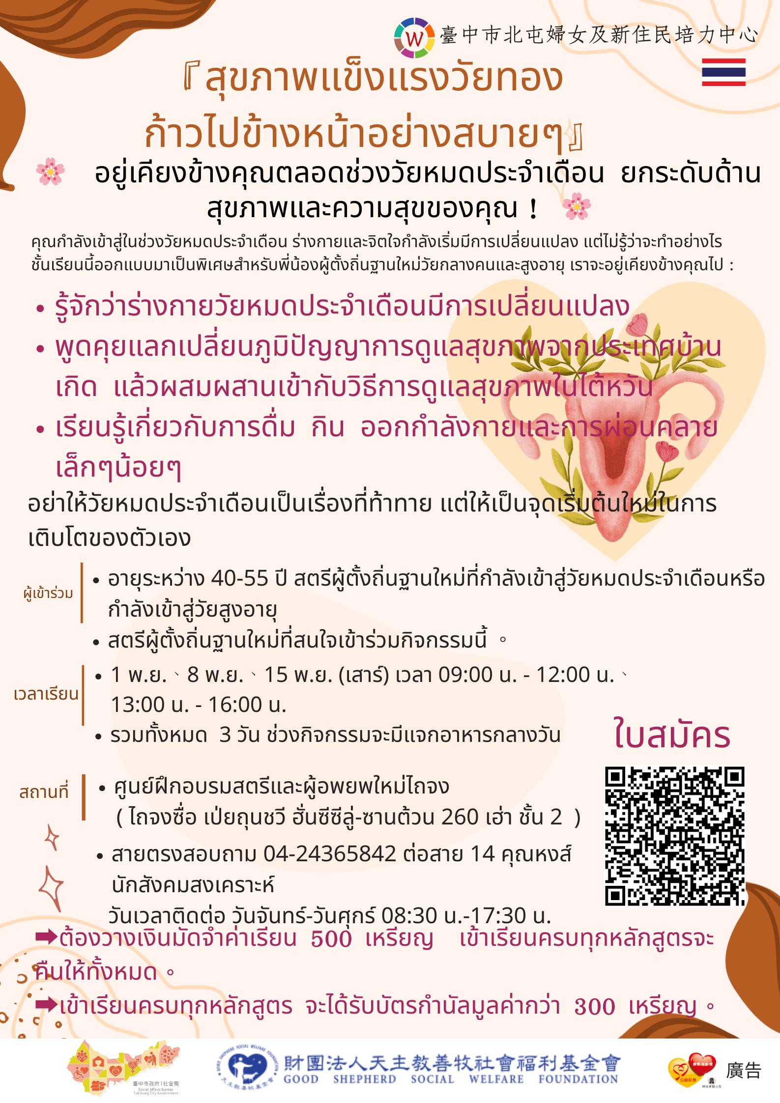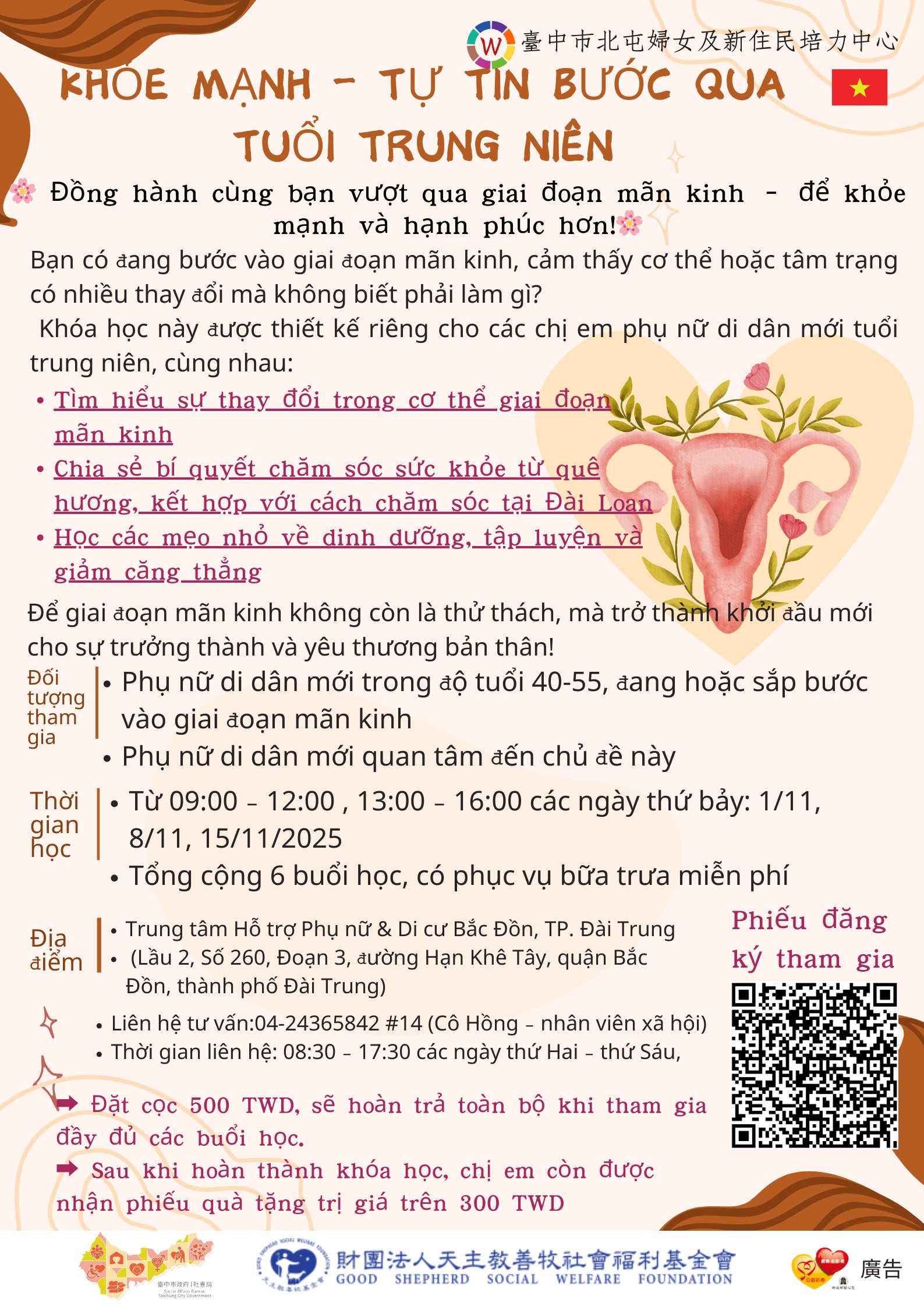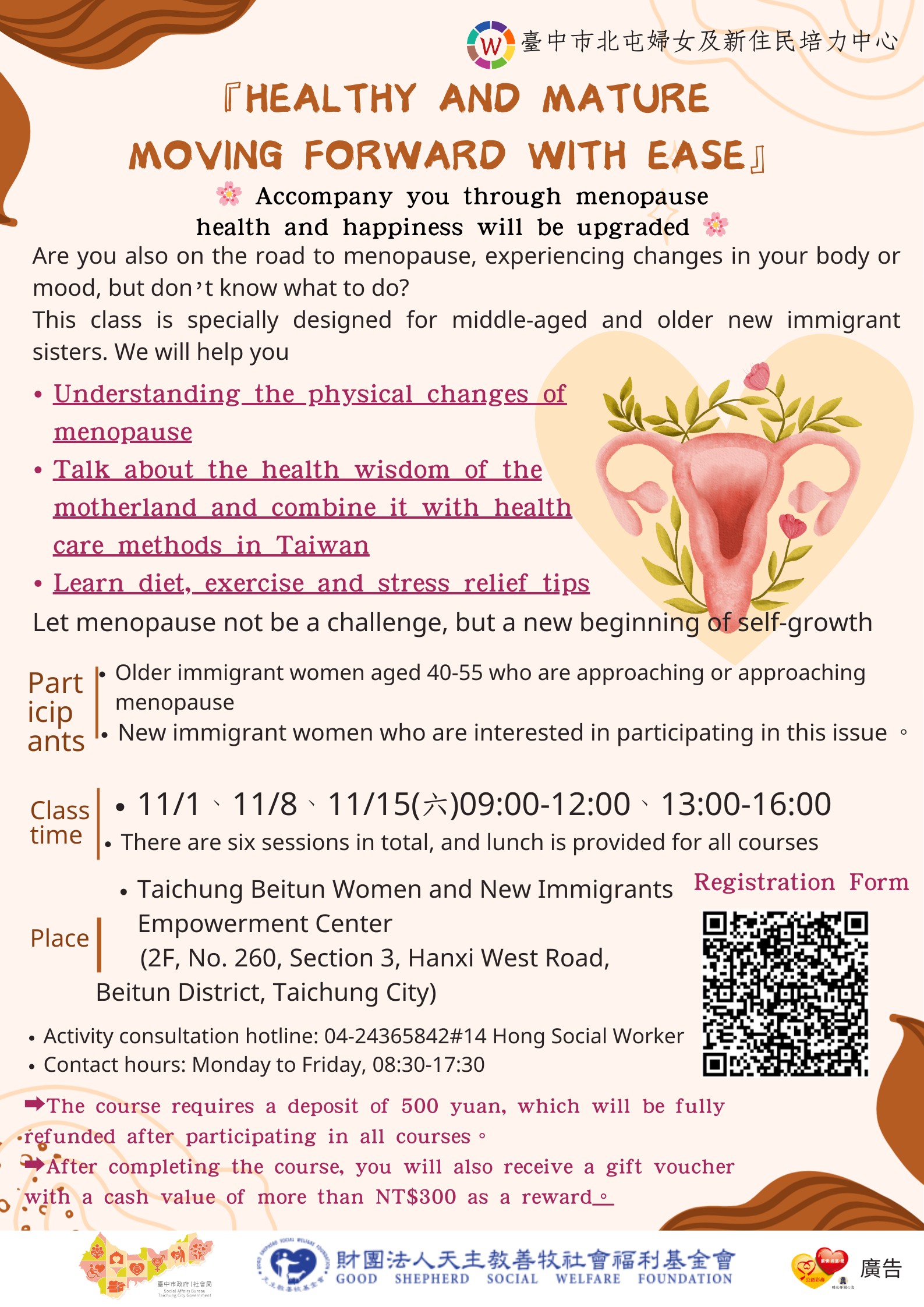 財團法人天主教善牧社會福利基金會承辦114年臺中市政府社會局「臺中市北屯婦女及新住民培力中心」,預計十一月辦理中高齡新住民婦女身體保健培力團體,預計招募40-55歲間,即將或正面臨更年期階段之中高齡新住民婦女,或對此議題有興趣參加之新住民婦女,全程參與者贈與同現金價值超過300元之商品禮券,詳情請見海報。