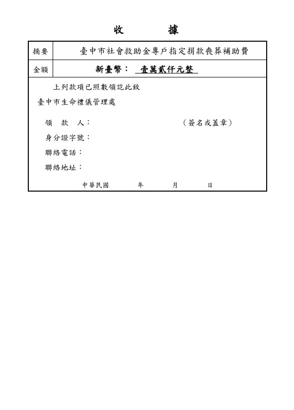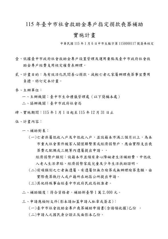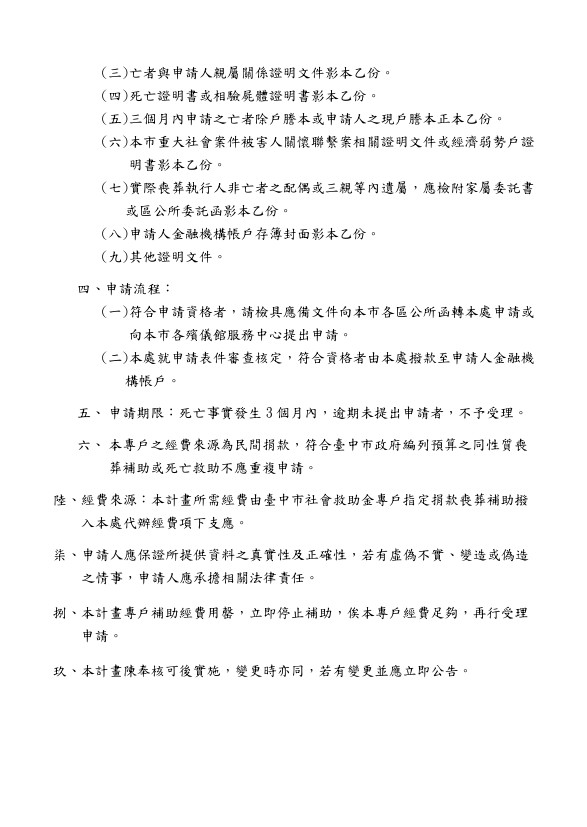 一、 依據臺中市政府社會救助金專戶設置管理及運用要點辦理。